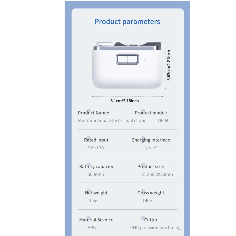 خیلی از ما ممکن است که با گرفتن ناخن هایمانچن دچار مشکل شده باشیم. چراکه ناخن گیر های قدیمی اسیب بسیاری به صدف و حتی پوست دست ما می رسانند. اما با ناخن گیر اتوماتیک D604 نه تنها این مشکل بلکه گرفتن ناخن فرزندانمان راحت تر شده است. دهانه منحنی طراحی شده در این ناخن گیر بهتر به نوک انگشتان می خورد، به طور موثر از آسیب تصادفی جلوگیری می کند. نور کمکی قسمت روی ناخن گیر پس از راه اندازی به طور خودکار به سر کاتر پاپ آپ اضافه می شود که دید را برای گرفتن ناخن ها بیشتر می کند. هنگامی که محصول در حال استفاده است، صدا در حدود 40 دسی بل است و صدای بیس مانند یک زمزمهی کوتاه می ماند. بدنه شیک و با کاربری آسان باعث می شود بچه ها عاشق کوتاه کردن ناخن شوند. طراحی ذخیره سازی پشتی اجازه می دهد تا ناخن های چیده شده در سطل زباله ناخن مکیده شوند تا از تمیزی و بهداشت اطمینان حاصل شود. برای استفاده کافی است دستگاه را شارژ کنید و استفاده کنید . دستگاه را روشن کنید هنگام استفاده روی دستگاه باید به سمت شما باشد . تجربه شخصی بنده برای استفاده کودک تجربه خوبی بود کاملا بیخطر هست و برای کودکانی که از ناخن گیر میترسند بسیار کارامد هست زیرا کاملا بی صدا و به آرامی ناخن را میسابد و شکل ناخن گیر به صورتی هست که باعث ترس نمیشود .
