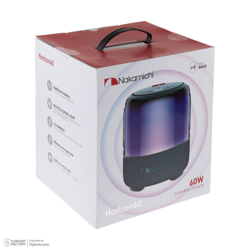 اقلام همراه شامل دفترچهراهنما، میکروفون و کابل شارژ است که امکان استفاده در حالت کارائوکه یا مکالمه را نیز ایجاد میکند. در جمعبندی، اسپیکر بلوتوثی ناکامیچی مدل Horizon 60 با توان خروجی قدرتمند، طراحی زیبا، نور RGB و باتری حجیم، انتخابی هوشمند برای دوستداران صداهای حرفهای و فضاهای مدرن است.