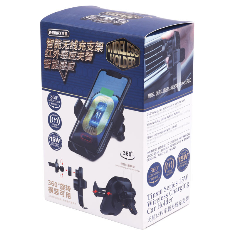 پایه نگهدارنده و شارژر بی سیم ریمکس مدل RM-C61 محصولی از کمپانی ریمکس است. این محصول موفق به کسب استاندارد های سلامت و ایمنی محصولات شامل CE / FCC / RoHS شده است. در این هولدر استحکام بیشتر از طریق ایجاد حالت مکش با استفاده از اهرم کوچک تعبیه شده در قسمت پایه و مناسب برای گوشی های 4٫7 الی 6٫7 اینچ ایجاد شده است. این محصول مجهز به تکنولوژی شارژ وایرلس مناسب برای گوشی های با امکان پشتیبانی از فناوری Qi با میزان توان خروجی متغیر و برابر با 5 / 7٫5 / 10 / 15 وات است. در این محصول تامین انرژی شارژر وایرلس از طریق اتصال پورت Type-C تعبیه شده بر روی بدنه به درگاه USB خودرو، دارای کلید لمسی جهت باز کردن بازوی گیره براکت شده است. امکان نصب روی دریچه کولر خودرو، تعبیه فضای خالی برای درگاه شارژ گوشی جهت شارژ هنگام رانندگی، مقاوم در برابر لغزش و کشسان در هنگام رانندگی را دارد. در این محصول بدنه ساخته شده از جنس پلاستیک ABS و PC مقاوم در برابر ضربه، فشار و ضربه های ناگهانی با قابلیت چرخش 360 درجه جهت تنظیم زاویه مناسب برای صفحه نمایش موبایل است.